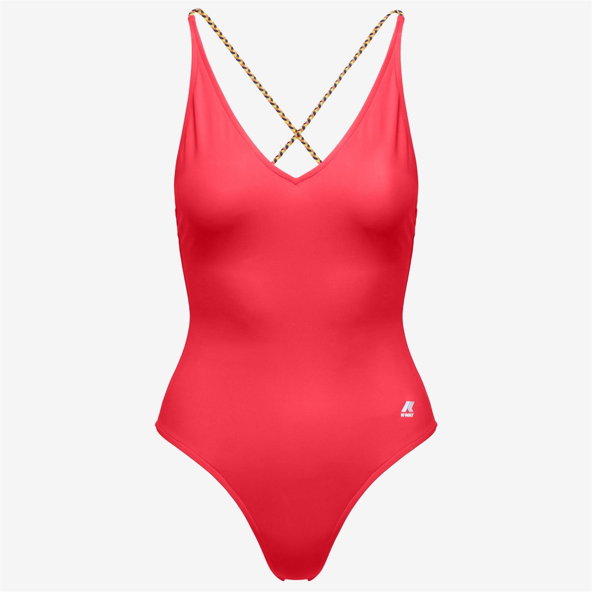 Le maillot de bain une pièce Crosel affiche une silhouette élégante et féminine avec un décolleté en V et des détails de logo latéraux. Les bretelles croisées dans le dos sont fabriquées en tissu tressé dans les couleurs emblématiques de K-Way.