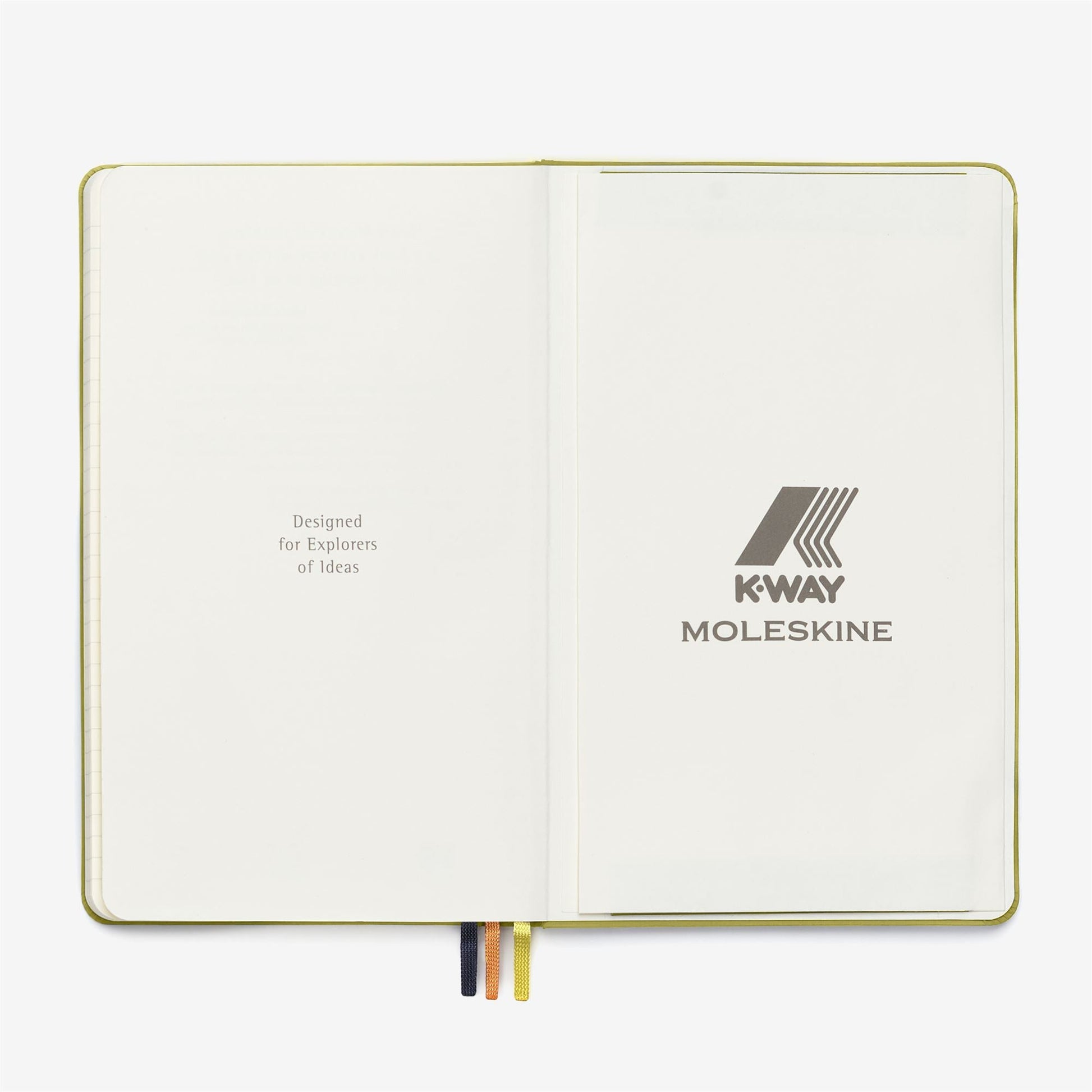 Un carnet couvert de tissu avec un élastique rayé qui rappelle la fermeture éclair inconfondable de la marque, trois marque-pages dans les mêmes couleurs et des pages d'ouverture et de fermeture personnalisées avec le logo K-Way.