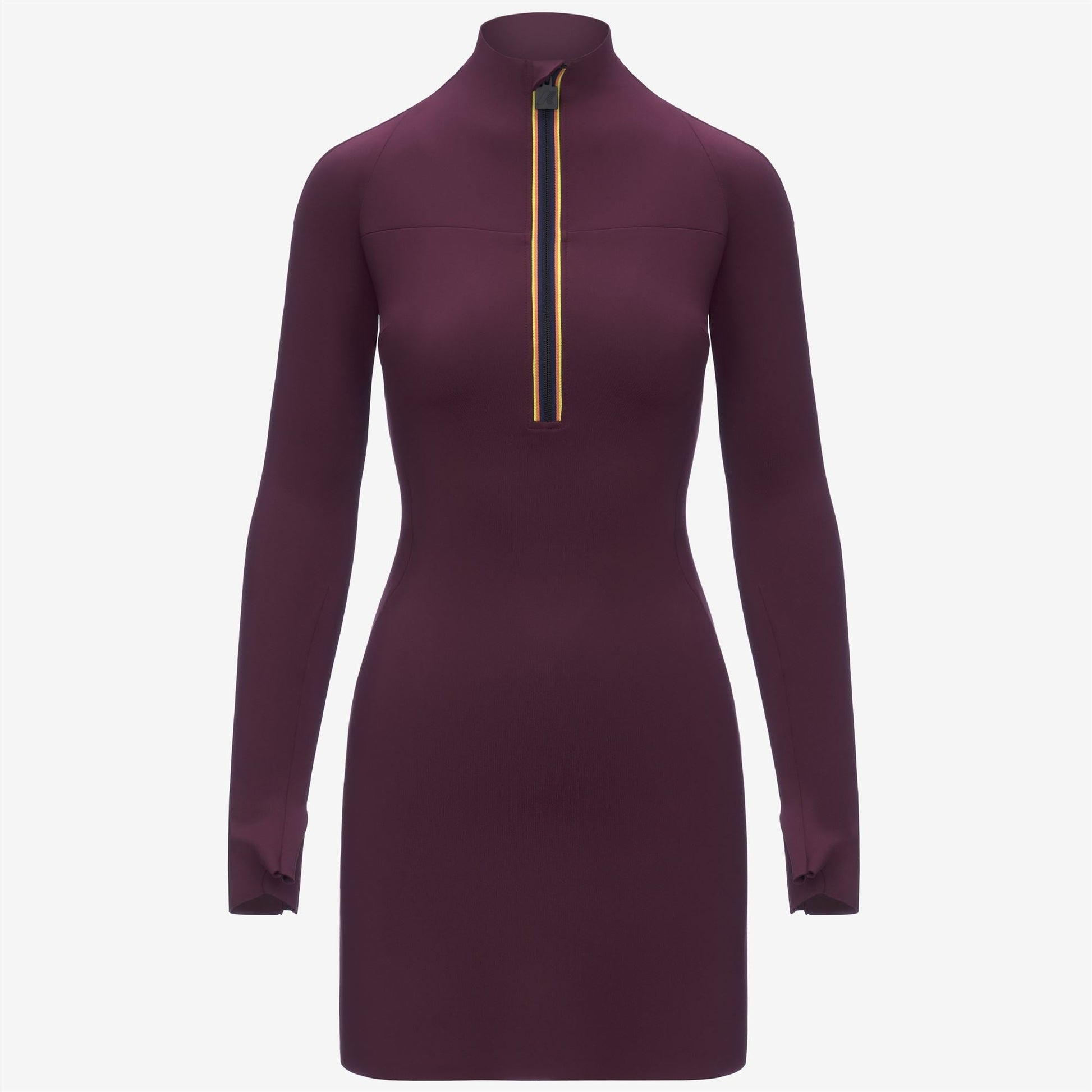 Minid est une robe mini pour femmes avec une coupe sculptée, ajustée comme une seconde peau. Fabriquée en tissu scuba lisse, elle présente un col haut avec une fermeture éclair à mi-longueur et des manches longues terminées par des poignets façonnés et des détails d'ouverture pour le pouce, offrant une touche élégante et sportive.